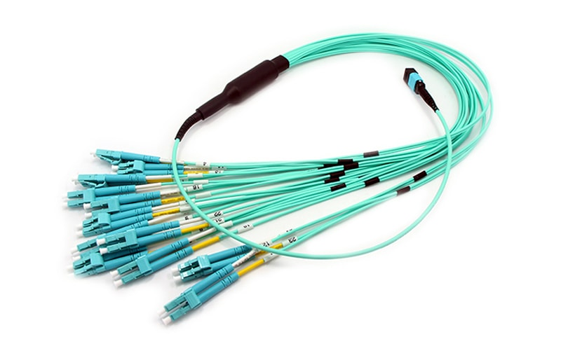 MTP® branch fiber patch cord is equipped with MTP®|MPO fiber connector on one end and 8/12/16/24 duplex LC/SC/FC fiber connectors on the other end. Branch fiber patch cord can be used in combination with optical modules, switches and other equipment to complete network upgrades, such as migration from 10G to 40G with lower insertion loss and higher performance.