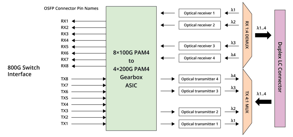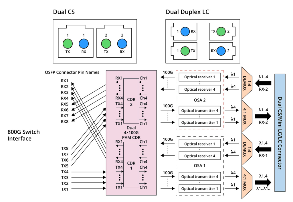 800G 2xFR4 and 800G 2xLR4 are two additional standards with similar internal structures. They consist of 4 wavelengths and operate at a single channel rate of 100 Gbps. By using Mux, the number of optical fibers required for this optical module is reduced to 4, as shown in the figure below. These standards are upgraded versions of 400G FR4 and LR4 transceiver module. They use CWDM4 wavelengths of 1271/1291/1311/1331nm. 800G 2xFR4 supports a transmission distance of 2km, and 800G 2xLR4 supports a transmission distance of 10km. The optical interfaces of these standards use dual CS or duplex LC interfaces. They are all suitable for 800G Ethernet, breakout 2x400G FR4/LR4, data centers, and cloud networks.