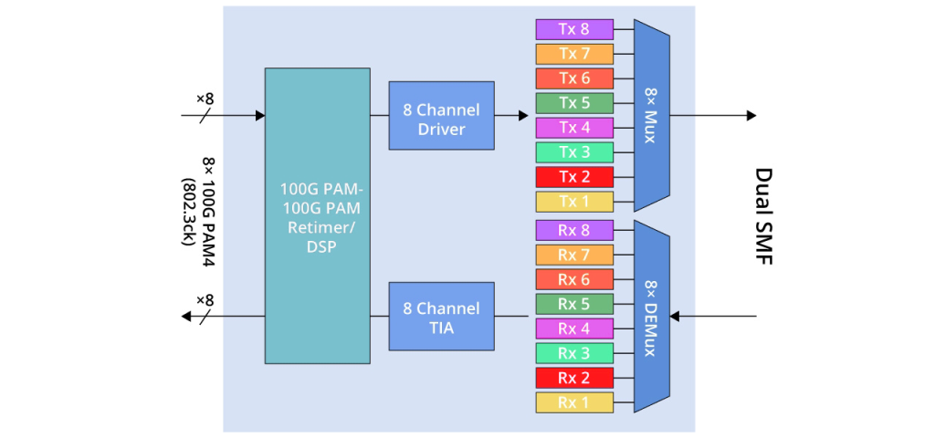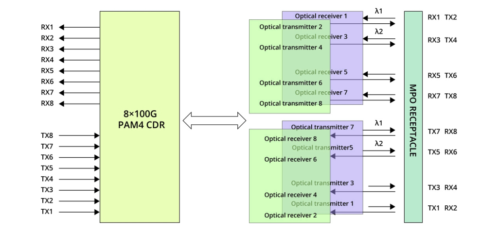 The internal architectures of these three standards are similar, with 8 transmit and 8 receive channels, a single channel rate of 100Gbps, and 16 optical fibers required.