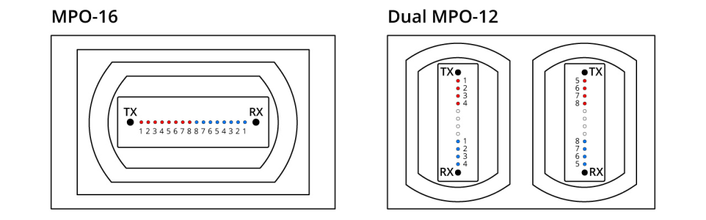 The 800G SR8 optical module uses VCSEL technology, with a wavelength of 850nm and a single-channel rate of 100Gbps PAM4. It requires the use of 16 optical fibers. This can be seen as an enhanced version of 400G SR4, with twice the number of channels as 400G SR4. The transceiver module uses 16C MPO or dual 12CMPO optical interfaces, as shown in the figure below. 800G SR8 fiber module is typically used for 800G Ethernet, data center links, or 800G-800G interconnects.